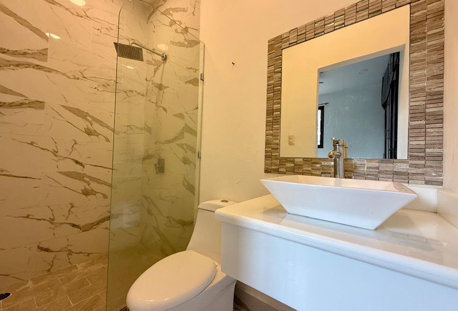 Con un terreno de 900 varas² y una construcción de 375 m², la propiedad cuenta con 4 habitaciones, cada una con su baño privado, más un baño de visitas para mayor comodidad. Su diseño de concepto abierto integra perfectamente la sala, el comedor y la cocina, creando un ambiente acogedor y funcional.